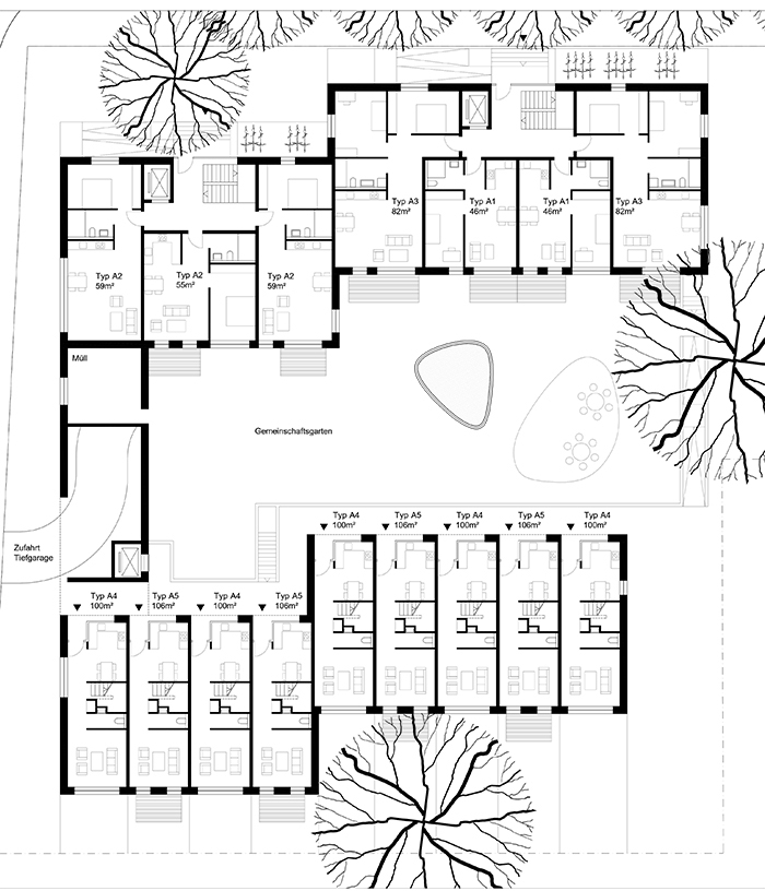 Das städtebauliche Umfeld des Planungsgebietes ist entlang des Friesenrings geprägt von dreigeschossigen Geschosswohnungsbauten mit Steildach sowie einigen Sonderbauten wie Schule, Kindergarten und Polizei auf der Nordseite. Richtung Süden entwickelt sich entlang der Martin-Luther-Straße ein Wohngebiet mit freistehenden, maximal zweigeschossigen Häusern mit steilen Walm- oder Satteldächern. Der städtebauliche Entwurf passt sich in der Geschossigkeit der Gebäude und der Dachformen an diese umliegende Struktur an. Entlang des Friesenrings werden zwei dreigeschossige Volumen vorgeschlagen, die mit ihrer Vorderkante zueinander versetzt stehen, um den erhaltenswerten Baum an der Straßenecke zu schützen.